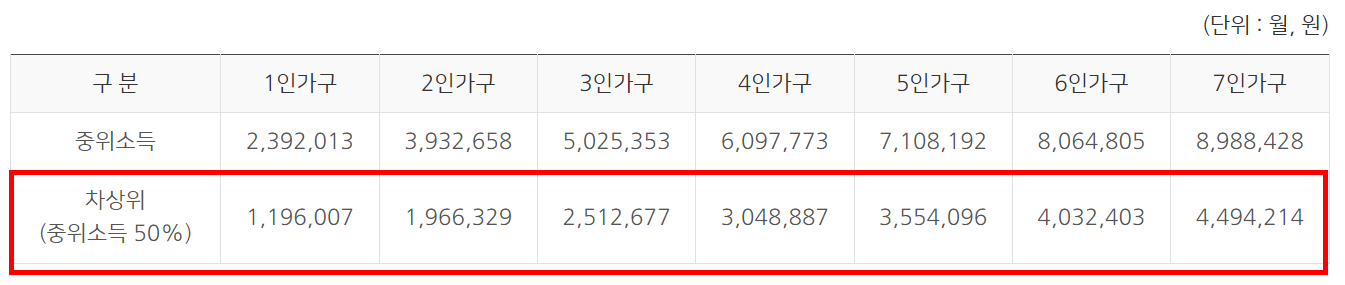 아래는 2025년 기준 중위소득 50%를 기준으로 한 가구별 소득 기준입니다.