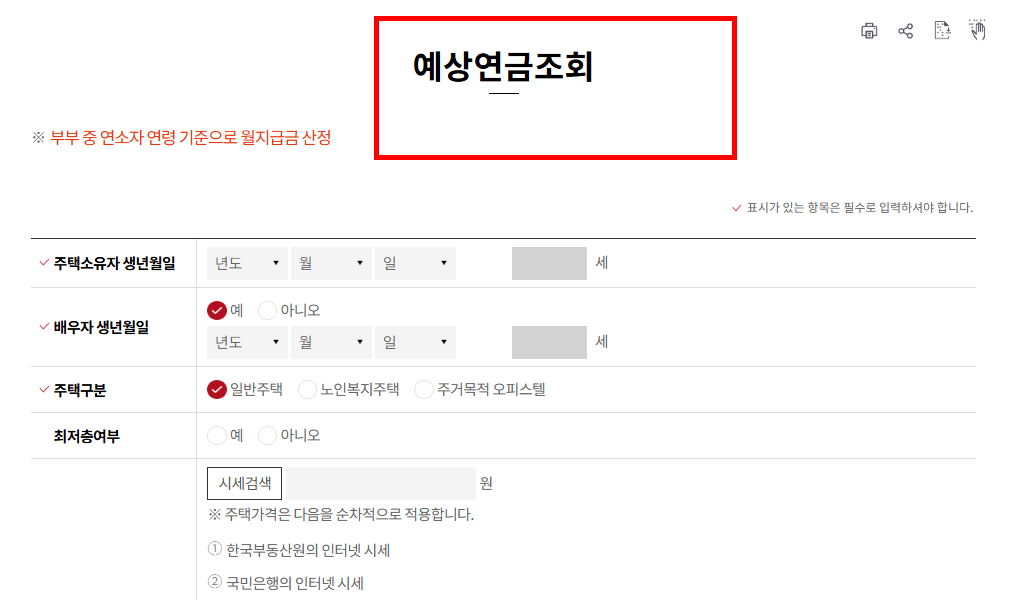 한국주택연금 홈페이지에서는 예상 주택연금을 미리 알아보실 수 있습니다.